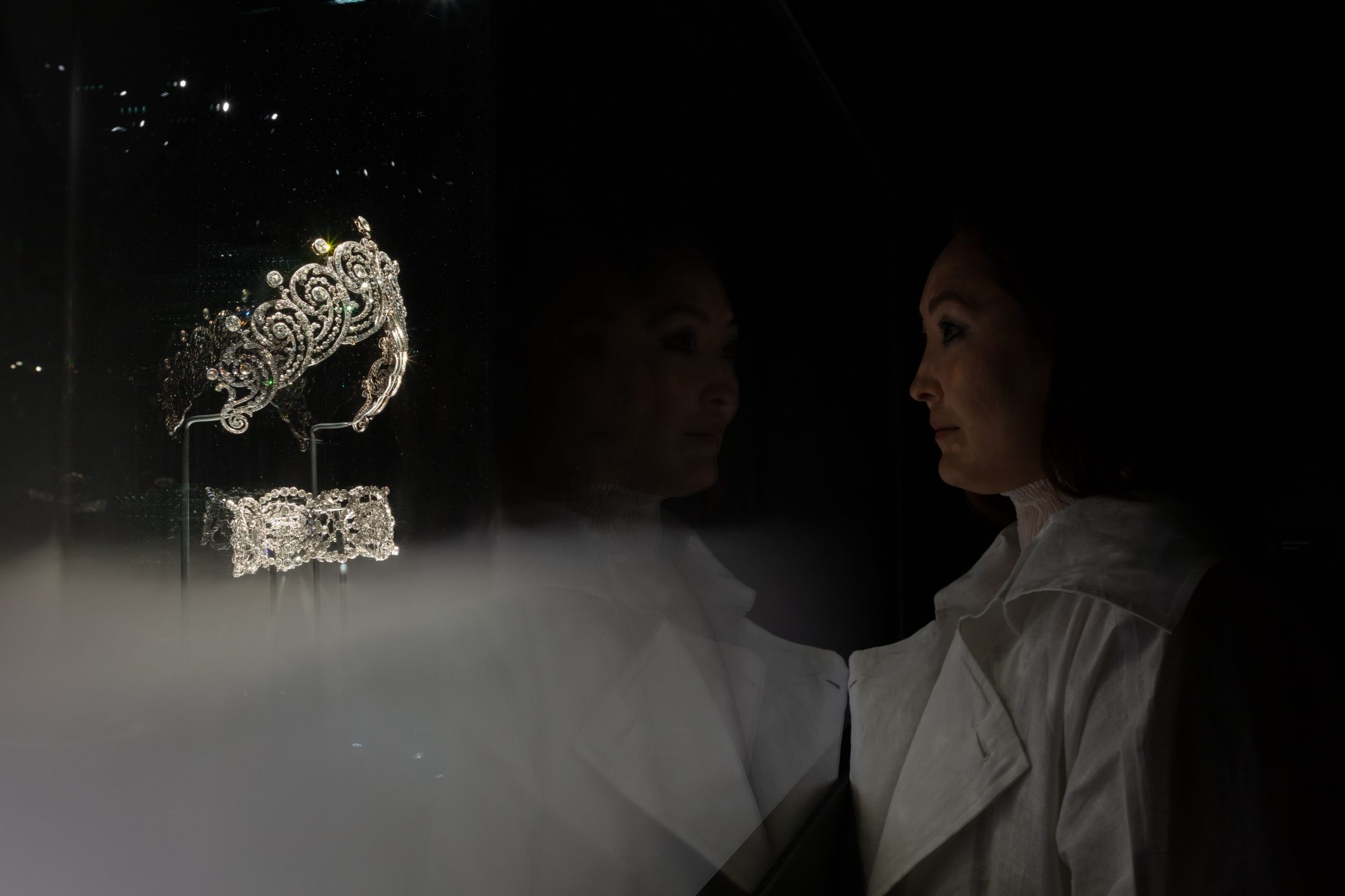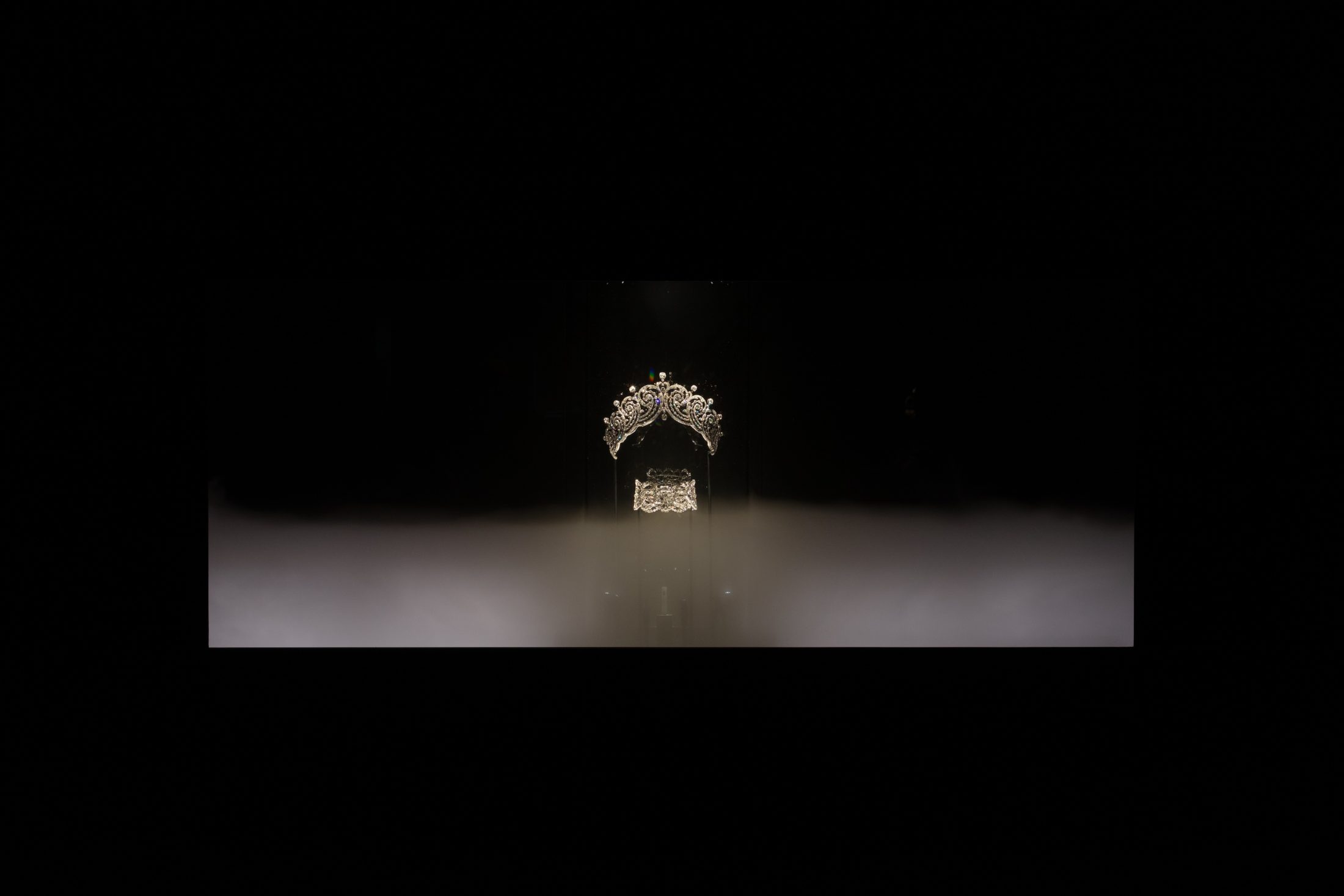 Elsewhere, the ticking of a Cartier watch mechanism—recorded by Khan and slowed to match the rhythm of a sleeping human heart—encourages a deeper awareness of time!s passage. Near the exhibition!s close, a single tiara appears to hover in a cloud of water vapour, evoking the Sufi concept of hīch, or "nothingness.” This ephemeral moment offers a space beyond material form: a brief encounter with absence, stillness, and presence.
